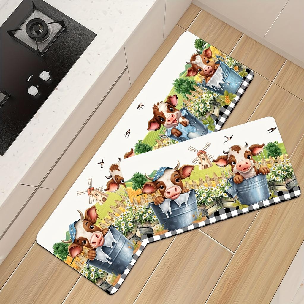 1 Stück Küchenmatte mit Aquarell-Farm, süße Kuh und Sonnenblume, bedruckt, weich, verdickt, wasserdicht, rutschfest, ölbeständig, Bodenmatte, Läufer, Teppich
