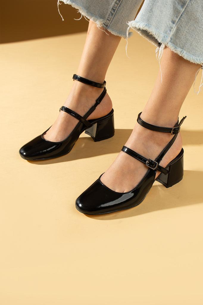 Damenschuhe mit doppelter Schnalle und Absatz 64-0405-24 aus Lackleder
