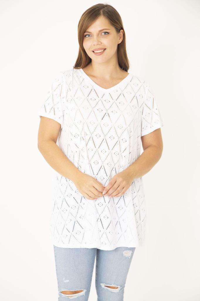 Women's Plus Size White Perforated Fabric V-Neck Short Sleeve Blouse