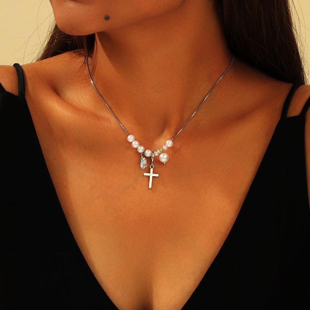 Mode Kreuz Diamant Einstellung Wassertropfen Anhänger Halskette künstliche Perle Perlen Halskette Damen Party Geschenk