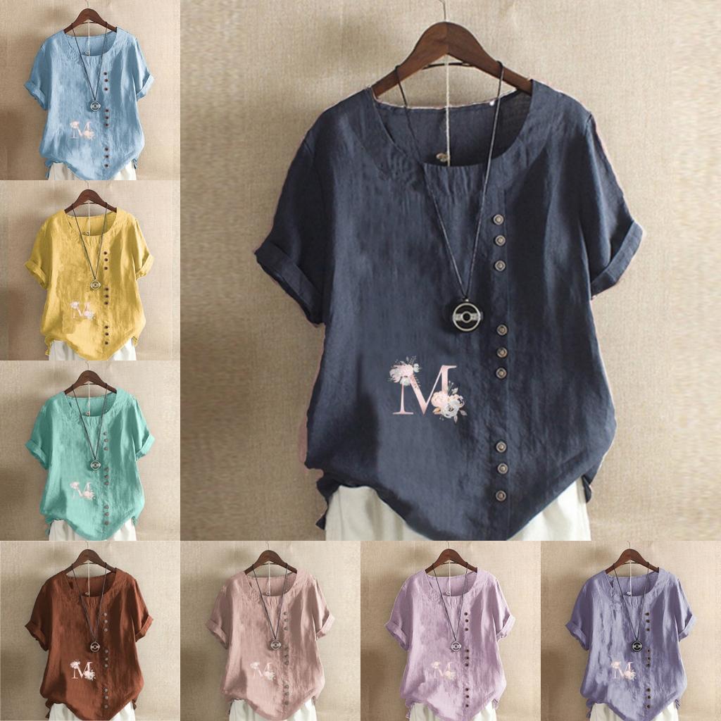 Women's Fashion Round Neck Short Sleeve T-shirt Casual Cotton Linen Graphic Shirt Leisure Loose Letter M Prined Summer Blouse Tops
