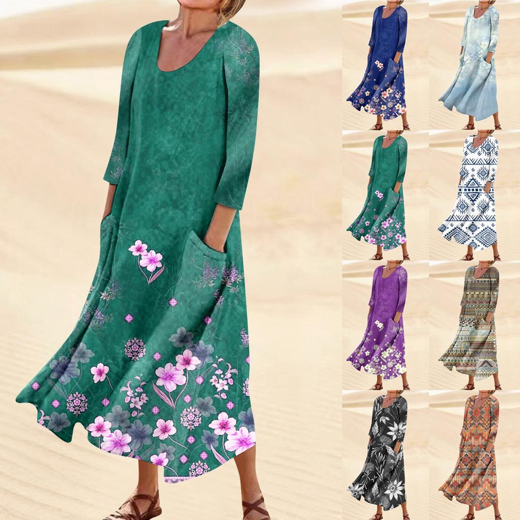 Kleid für Damen, Frühling, Boho, lässig, modisch, 3/4-Ärmel, Kleid für den Urlaub, große Größe