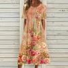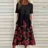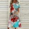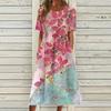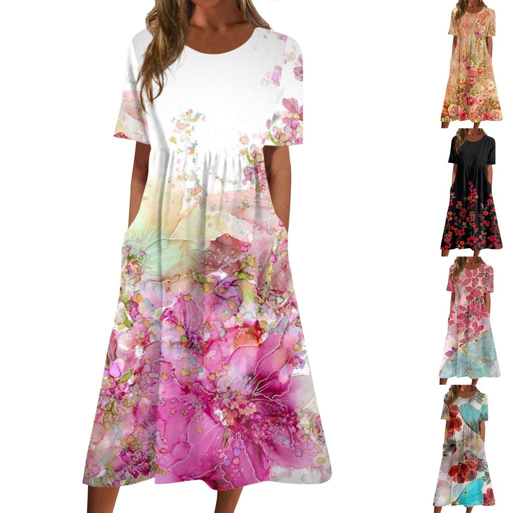 Damen-Freizeitkleider, bedruckte Kleider, Sommerkleider, bedruckt, plissiert, Rundhals-Midi-Kleider, Basic, klassisch, Outdoor, täglich, kurzärmelig, lockere Kleider