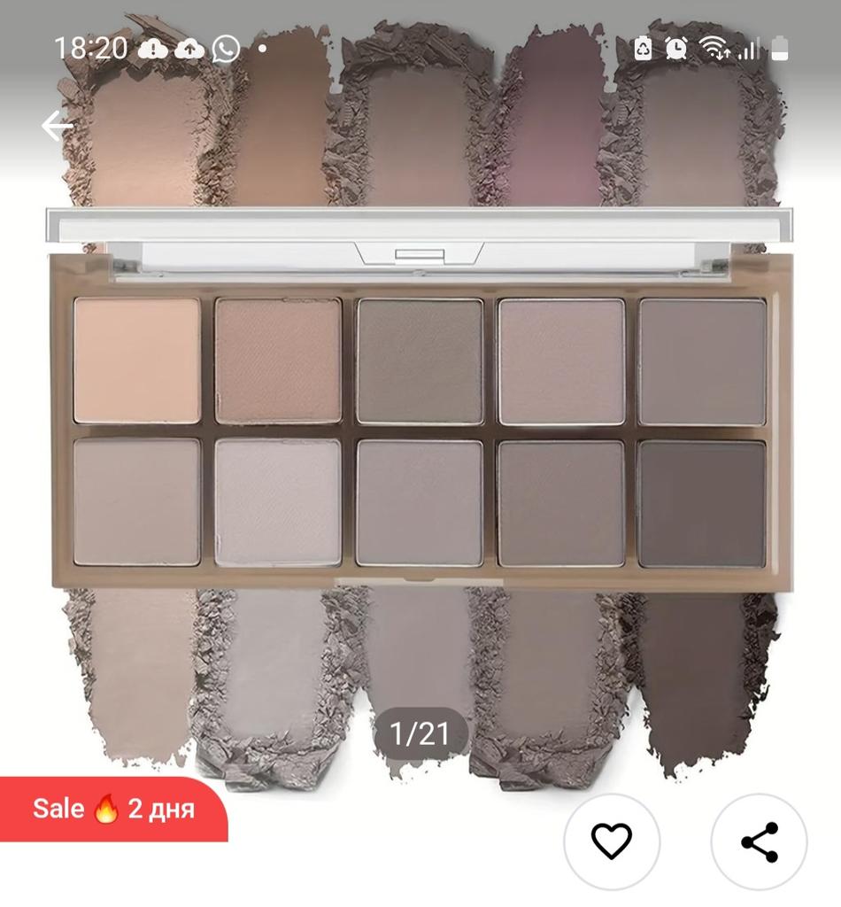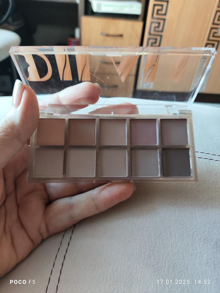 Die Palette der Nude-Alltagsschatten besteht aus 10 verschiedenen Farben. Es hat eine leichte Textur, die gut auf die Augenlider passt, wenn es unter der Basis aufgetragen wird – im Sommer hält es bis zu 5 Stunden, im Herbst – länger 🤩 Alle Farben sind matt und lassen sich gut miteinander kombinieren, um einzigartige Bilder zu schaffen. Es hat keine Allergien ausgelöst, die Box ist aus Kunststoff, der Spiegel und der Applikator sind nicht im Lieferumfang enthalten (ich verwende Pinsel). Ich empfehle es, Mädels ❤️