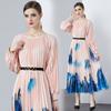 Spring Autumn Women Full Sleeve Print Oversized Long Maxi Holiday Party Pleated Dresses with Belt
