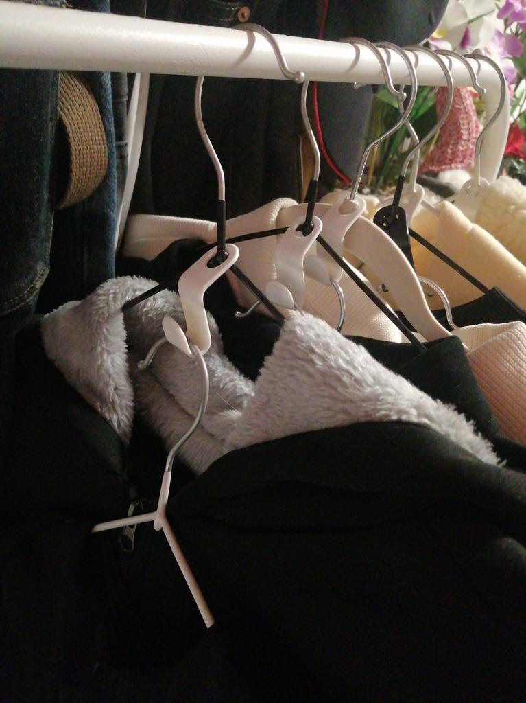 Interessante Haken für Kleiderbügel sparen Platz im Schrank. Werde sie für Blusen verwenden.