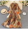 American Chic Maxikleider für Damen Bedrucktes O-Ausschnitt Laternenärmel Vestidos De Mujer A-Linien-Schnürkleid