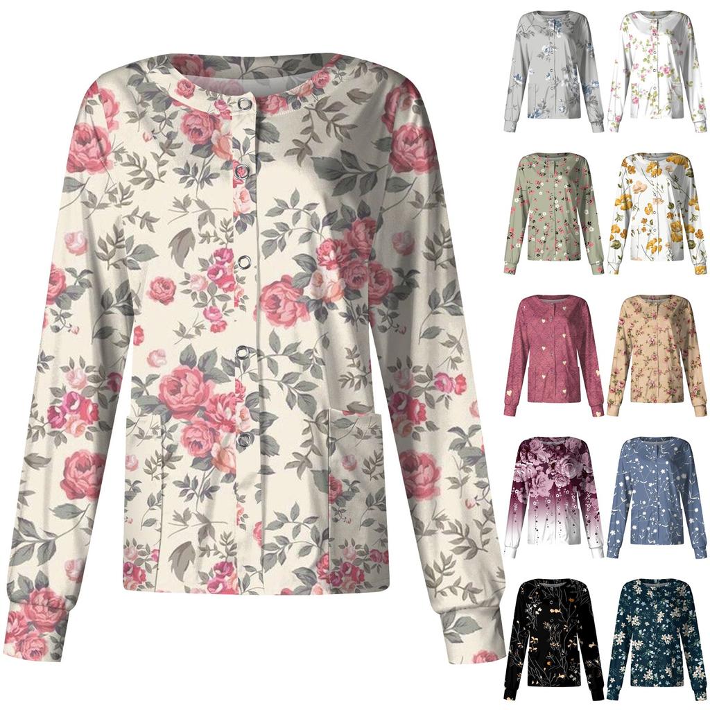 Frauen Langarm Druck Muster Tasche Arbeiten Stehkragen einreiher Schutz Overalls Strickjacke Jacke Top