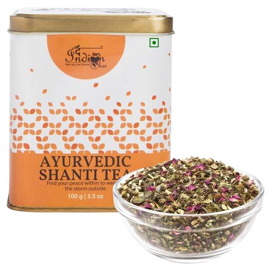 Tulsi (Heiliges Basilikum), Fenchelsamen, Süßholzwurzel, Sternanis, Orangenschale, Pfefferminzblätter, Zitronengras, Zitronenschale, Brahmi, Ashwagandha, Lavendel und Rosenblätter.