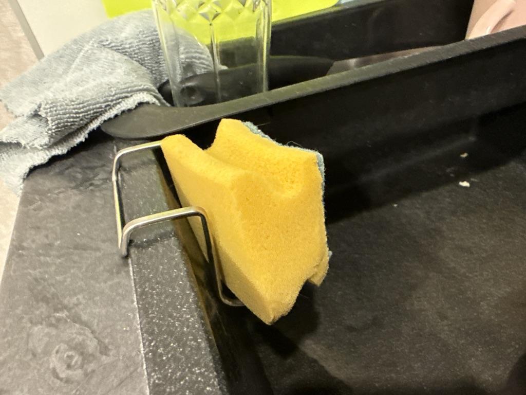 Der Haken ist aus Metall, stabil und hält gut. Ich habe ihn an der Spülbeckenklappe befestigt, daran hängt man beim Kochen eine Mülltüte.