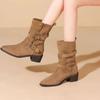 Modische, spitze Zehenpartie, warme Stiefeletten aus Wildleder für Damen im Winter, dicker Absatz, Metallgürtelschnalle, Design, moderne Stiefel für Damen