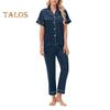 Gönnen Sie sich luxuriösen Komfort mit unserem Damen-Pyjama-Set. Das Pyjama-Oberteil verfügt über einen klassischen Reverskragen, einen Knopfverschluss vorne, einen V-Ausschnitt und ein hüftlanges Design mit kontrastierender Paspelierung für einen Hauch von Eleganz. Dank der praktischen Brusttasche haben Sie alles Wichtige immer griffbereit. Die Pyjamahose ist mit einem elastischen Bund ausgestattet, der das An- und Ausziehen erleichtert und jederzeit eine perfekte Passform gewährleistet.