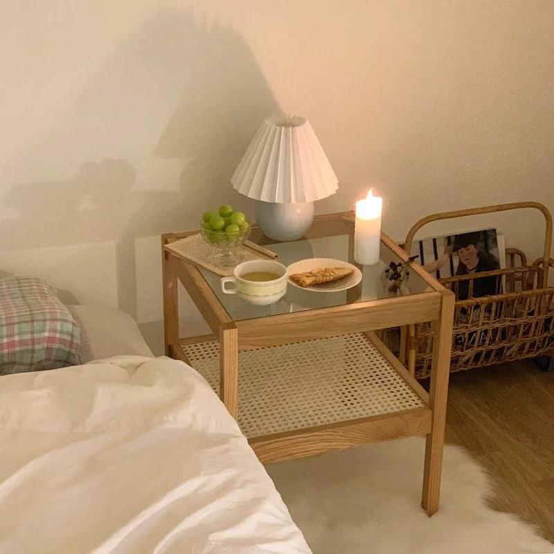 Couchtisch, Massivholz-Beistelltisch, quadratischer Korbtisch, kleiner japanischer Teetisch, quadratischer Glasschrank, koreanische Nachttische