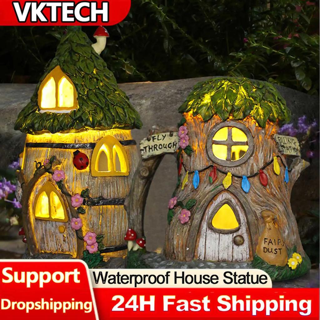 Hausstatue, solarbetriebene LED-Lichter, Gartenfee, Outdoor-Gehweg-Licht, Hof-Dekor, Harzhäuser, Skulpturen, Cottage-Lampen-Dekor