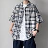Sommer Neues Farbblockiertes Kariertes Revershemd Japanisches Retro Taschen Dekoration Kurzarmhemd