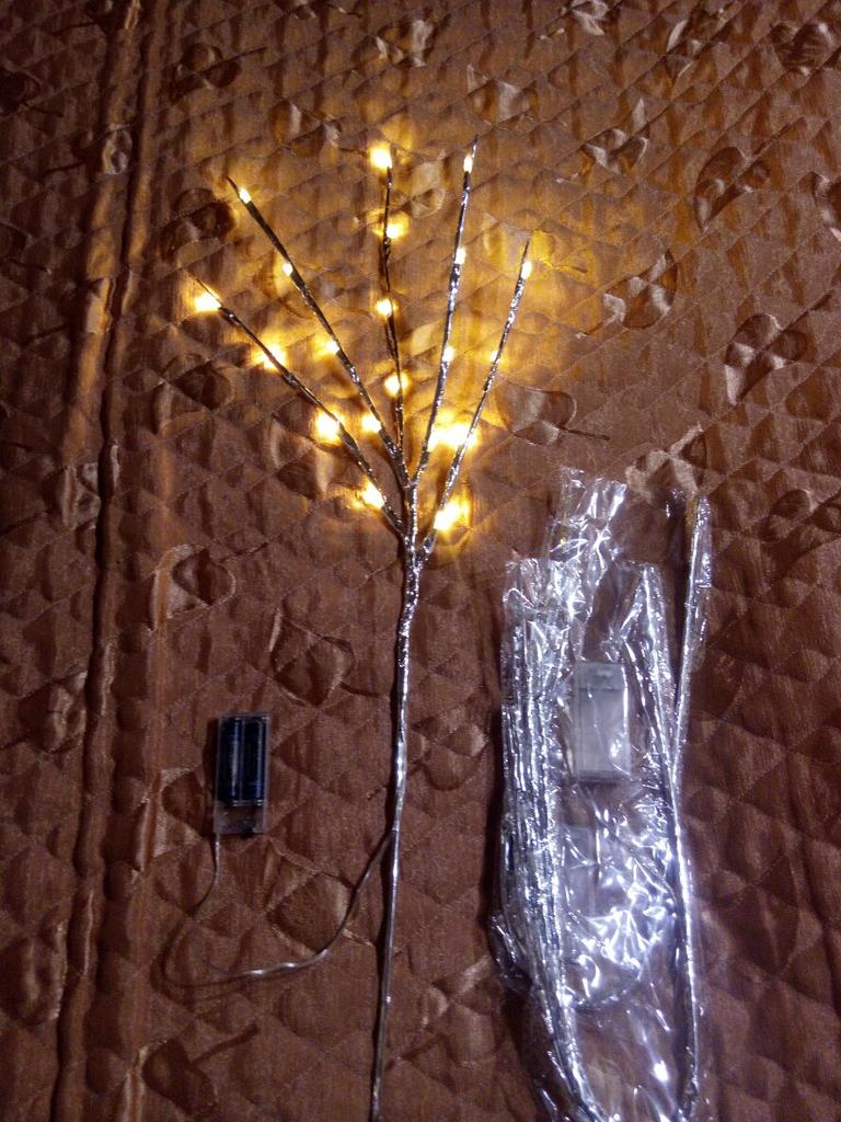 Zweig mit LEDs. In Folie verpackt. Es sind keine Batterien im Lieferumfang enthalten.