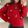 Red Christmas Themed Sweater Women's Long Sleeved Threaded Pullover Loose Casual Women's Chic Top Clothing