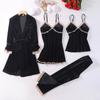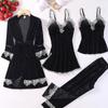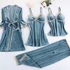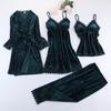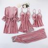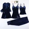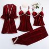 Burgunder Velours Pyjama Anzug Frauen 4PCS Kimono Robe Nachthemd Set Nachtwäsche Dame Winter Warm Gestreiften Gold Samt Bademantel Kleid