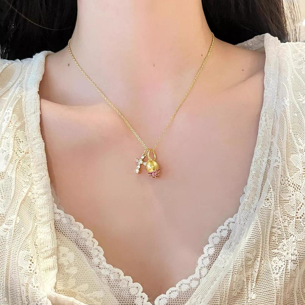Anenjery Pink Zircon Pinecone Cross Pendant Necklace for Women New High End Sweet Exquisite Clavicle Chain Jewelry Gift