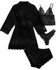 Damen Satin Pyjama Set 4-teilig Blumenspitzenbesatz Cami Dessous Nachtwäsche mit Morgenmantel Nachtwäsche Spitzen-Cami Shorts Loungewear Rosa