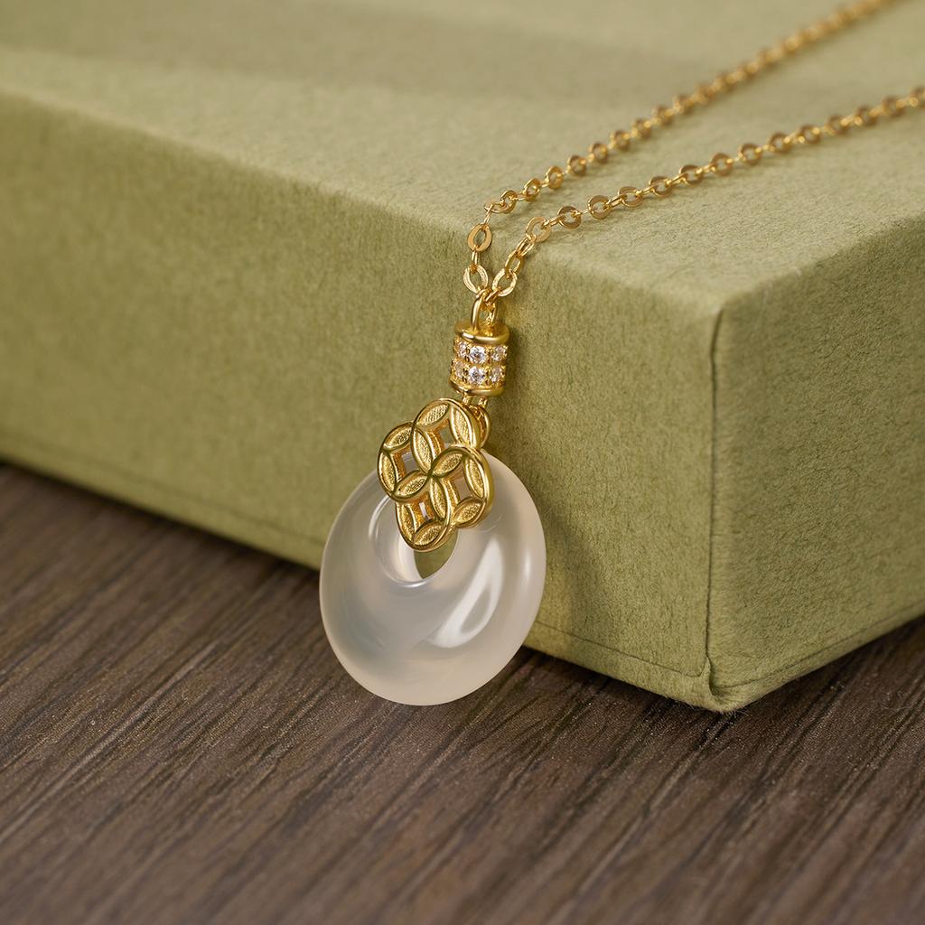 S925 sterling silver copper coin chalcedony safety buckle necklace women's retro collarbone chain fashion light luxury pendant