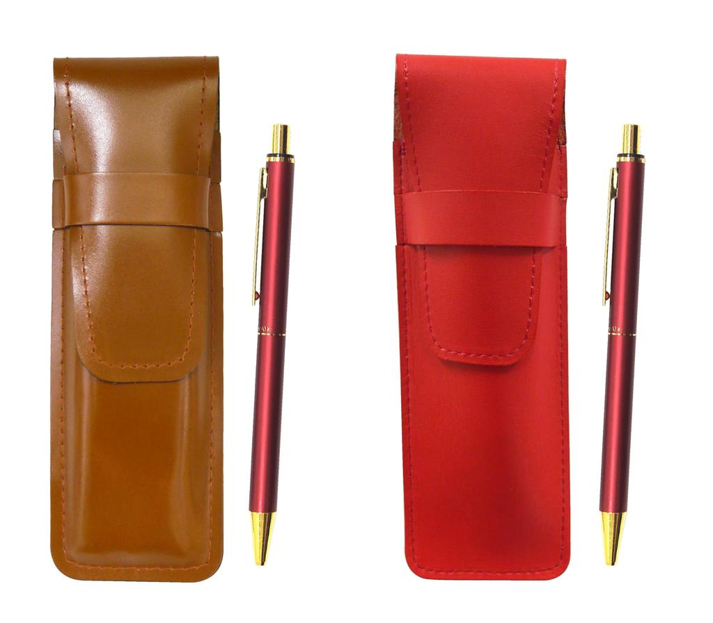 Set aus Stiftetuis aus japanischem Rindsleder (1 rot, 1 braun) und 2 Kugelschreiber mit Aluminiumschaft (roter Schaft)