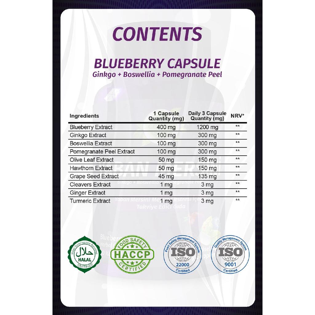 Blueberry Capsule Net: 60 Herbal Capsule (1000 mg) Capsules content consists of plant extracts.