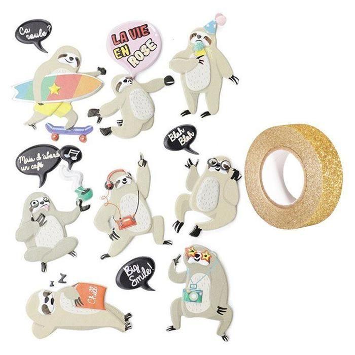 15 3D-Faultier-Aufkleber + 5 m goldenes Glitzer-Klebeband