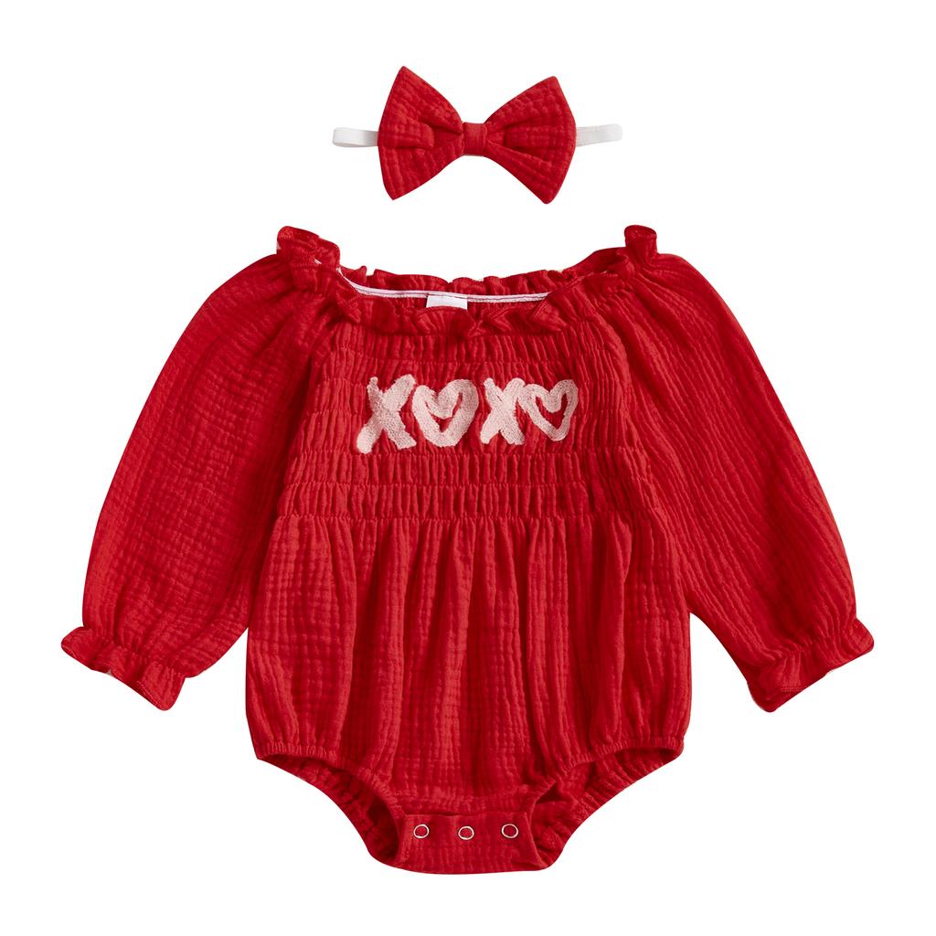 Baby Mädchen Strampler Valentinstag Kleidung Herz Buchstaben Stickerei Langarm Frühling Bodys mit Stirnband