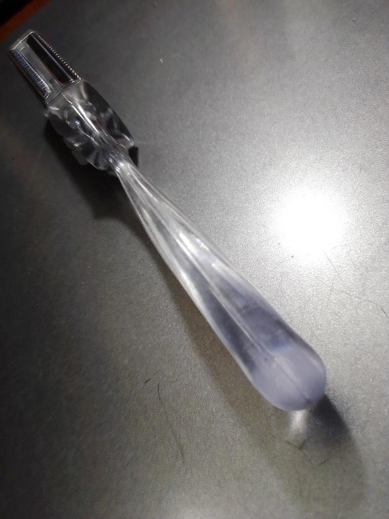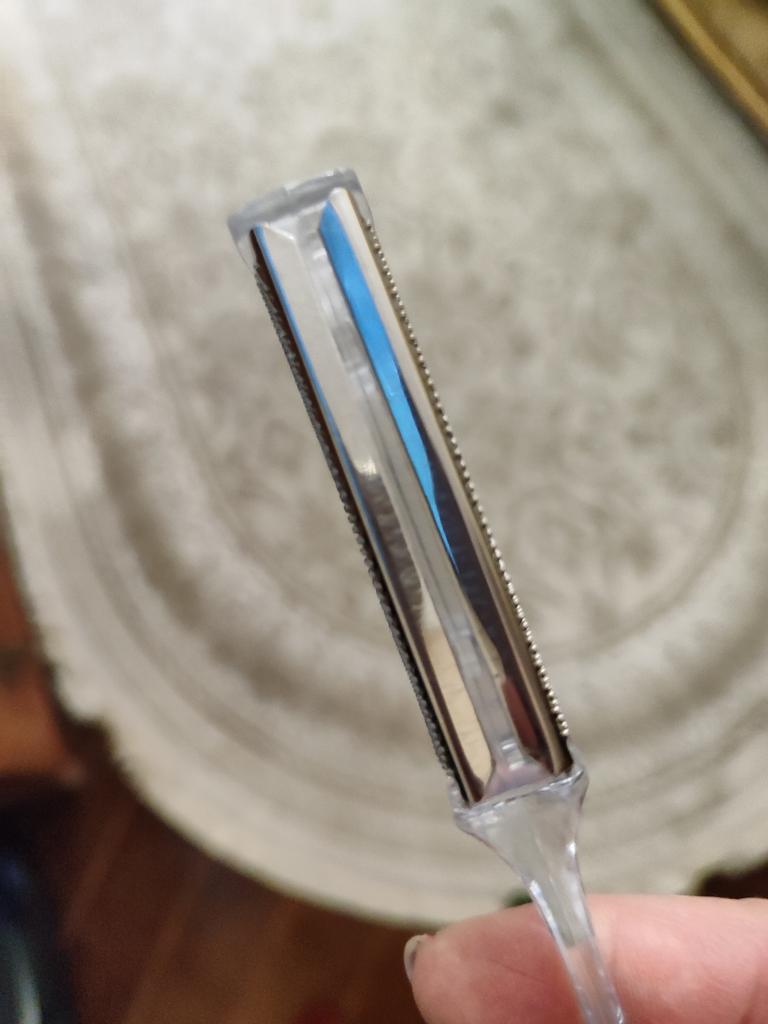 Der Griff ist transparent, das Metall ist scharf! Die Konstruktion ist ziemlich robust! Ich traue mich noch nicht, ihn zu benutzen.