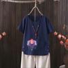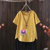 Perfect for summer, this casual T-shirt features a dragonfly print that draws inspiration from European and American styles. Made from a comfortable blend of cotton and hemp, it provides a lightweight and breathable feel. The short-sleeved and V-neck design adds a touch of elegance while ensuring an easy fit. Perfect for going outside in warm weather, this T-shirt effortlessly combines style with comfort.