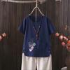 Perfect for summer, this casual T-shirt features a dragonfly print that draws inspiration from European and American styles. Made from a comfortable blend of cotton and hemp, it provides a lightweight and breathable feel. The short-sleeved and V-neck design adds a touch of elegance while ensuring an easy fit. Perfect for going outside in warm weather, this T-shirt effortlessly combines style with comfort.
