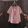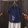 Perfect for summer, this casual T-shirt features a dragonfly print that draws inspiration from European and American styles. Made from a comfortable blend of cotton and hemp, it provides a lightweight and breathable feel. The short-sleeved and V-neck design adds a touch of elegance while ensuring an easy fit. Perfect for going outside in warm weather, this T-shirt effortlessly combines style with comfort.