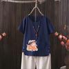 Perfect for summer, this casual T-shirt features a dragonfly print that draws inspiration from European and American styles. Made from a comfortable blend of cotton and hemp, it provides a lightweight and breathable feel. The short-sleeved and V-neck design adds a touch of elegance while ensuring an easy fit. Perfect for going outside in warm weather, this T-shirt effortlessly combines style with comfort.