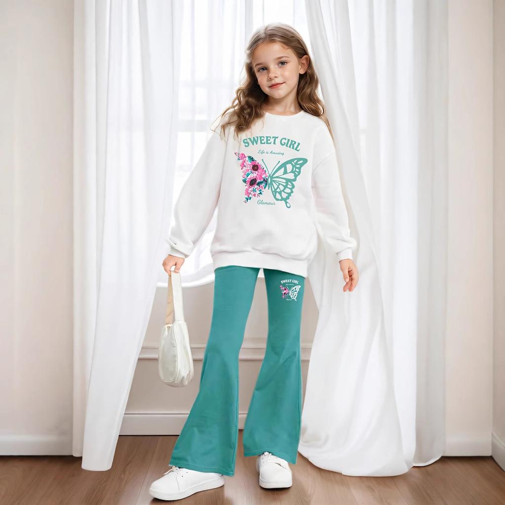 Mädchen 2-teiliges Set & Schmetterlingsdruck Langarm-Hoodie + Schlaghosen Herbst Kinder Freizeitanzug