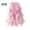 Damen-Kuchenrock, mittelhoher Schnitt, elastische Taille, unregelmäßiger Saum, Midirock, einfarbig, Mesh, Swing, langer Rock für den Alltag