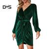 Lady-Dating-Kleid, V-Ausschnitt mit Bindegürtel, schmale Taille, lange Ärmel, Samtstoff, unregelmäßiger Saum, Abendkleid in reiner Farbe, Minikleid für Abschlussball und Party