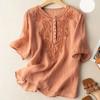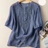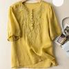 Bluse aus Baumwollleinen mit Blumendruck für Damen, Frühling und Sommer, literarisches Retro-Stickerei-Oberteil, lässig, kontrastfarben, Rundhalsausschnitt