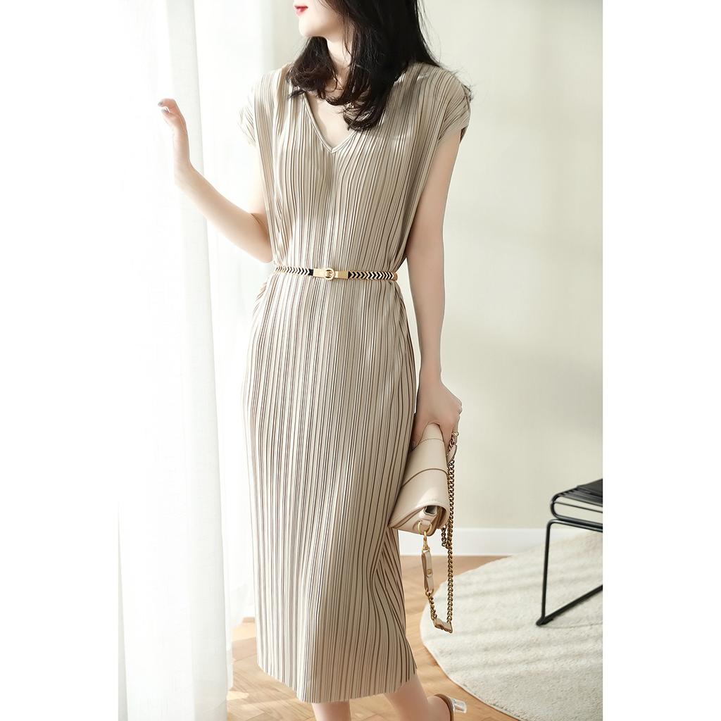 Miyake Plisseekleid im Frühling und Sommer Neu Gerades V-Ausschnitt zum Kaschieren des Bauches und für einen schlanken und lockeren Look.