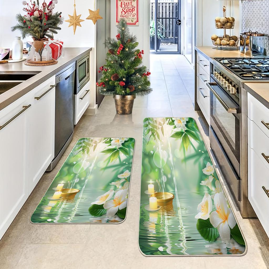 1 x Anti-Ermüdungs-Küchenteppich, Blumenmuster mit Seeufer-Aufdruck, wasserdicht, rutschfest, dick gepolstert, robuste, bequeme Stehmatte für die Küche