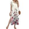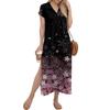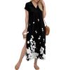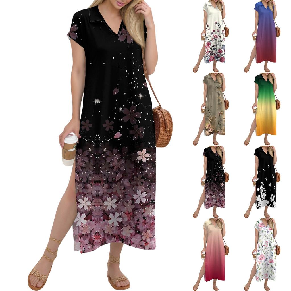 Damen Langer Rock Lässiges V-Ausschnitt Langes Hemdkleid Lockerer Schlitz Urlaub Kurzarmkleid