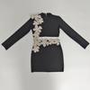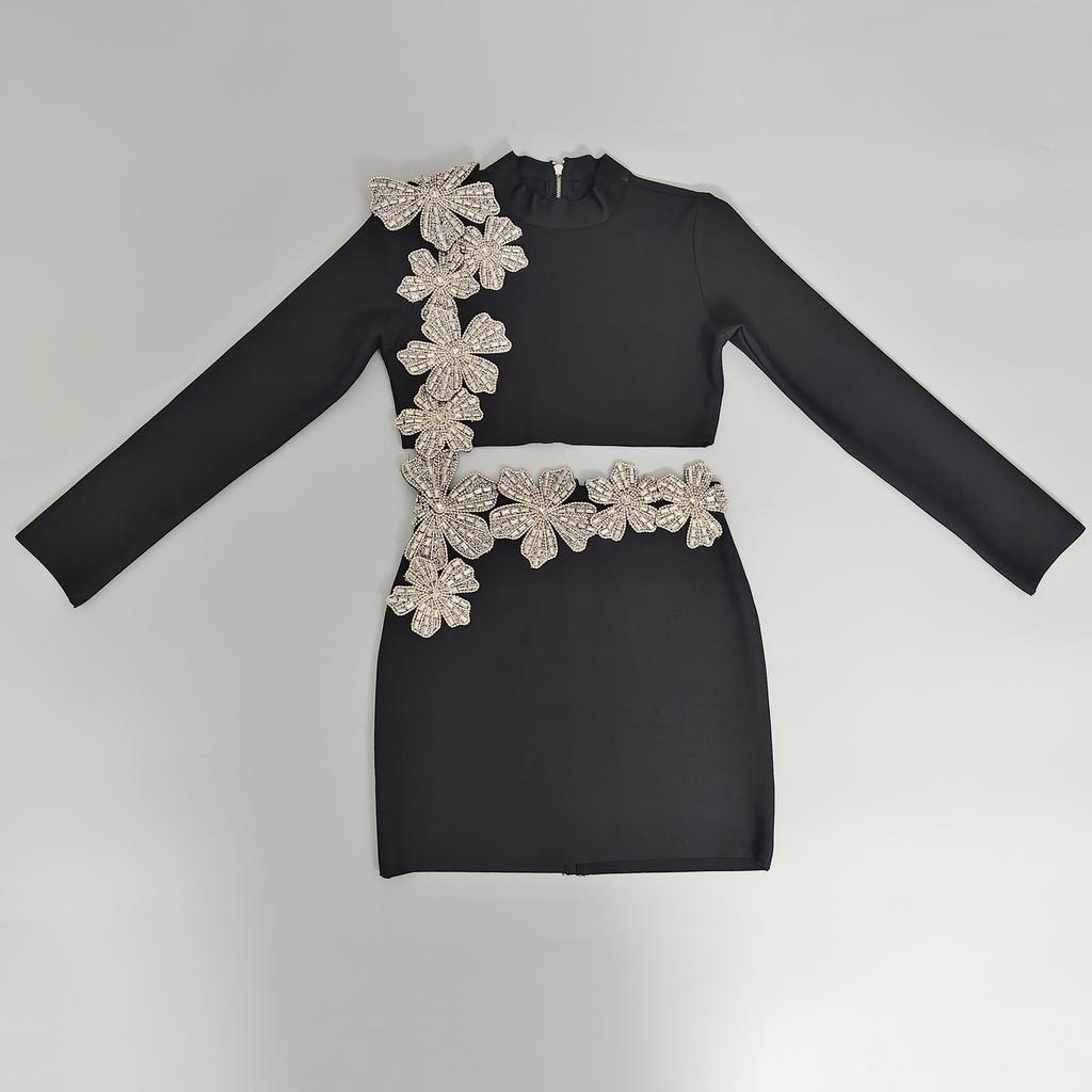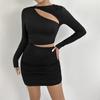 New fashion bandage set, long-sleeved fixed diamond half-turtleneck top and short hip skirt, black two-piece set.
