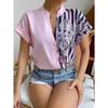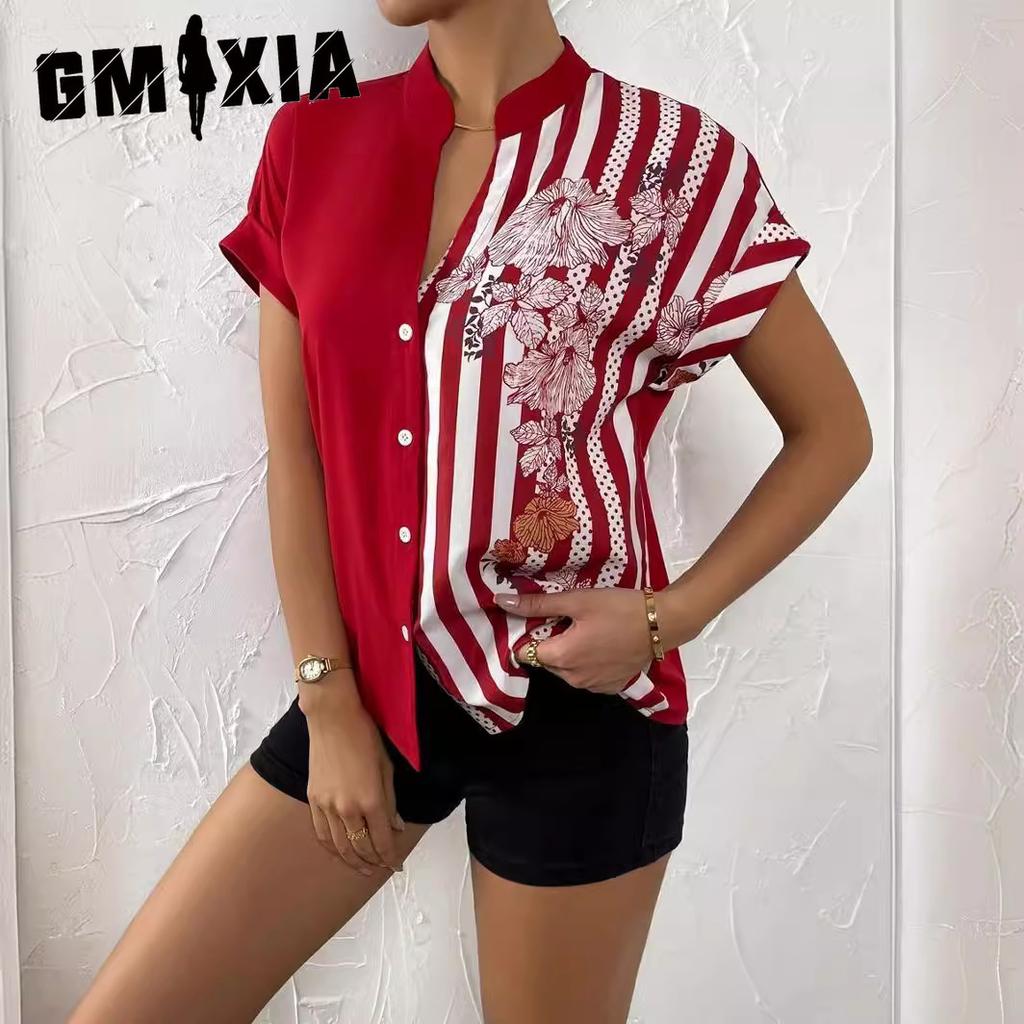 GMXIA Summer Women's Semi-open Collar Fashion Print Patchwork Casual Shirt