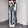 Lady Summer Distressed Raw Edge Gerade Hose Split Denim Flare Pants Frau Koreanischer Stil Hohe Taille Bandage Jeans