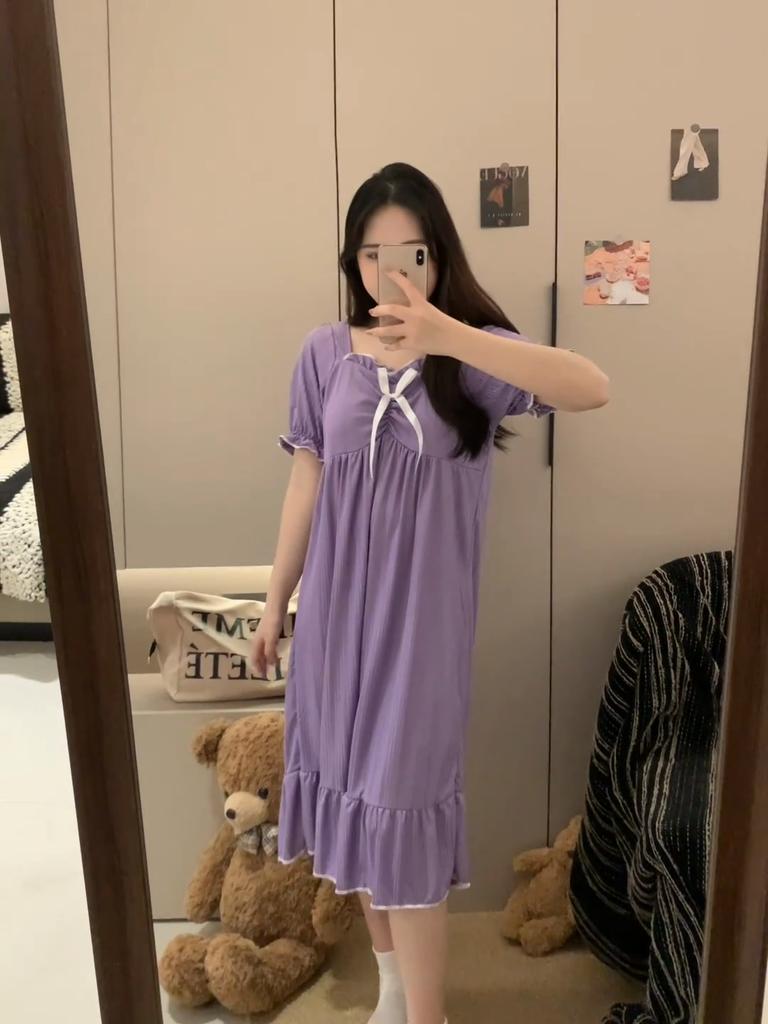 Damen Kurzarm Nachthemden mit Brustpolstern Weiblich Sommer einfarbig Homewear junges Mädchen süßes Nachtkleid lässig locker Loungewear