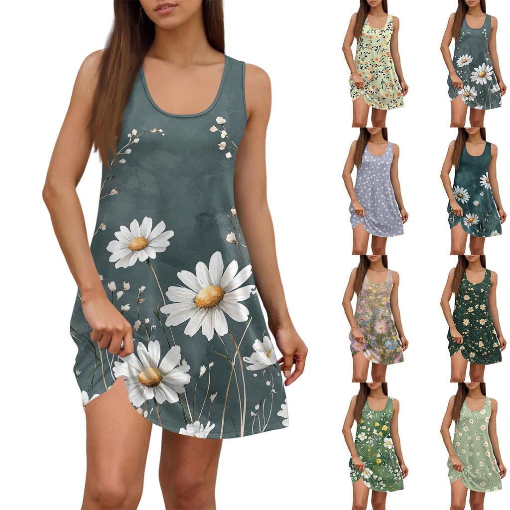 Damen Sommerkleid, lässig, quadratischer Ausschnitt, Blumendruck, ärmellos, mit Taschen