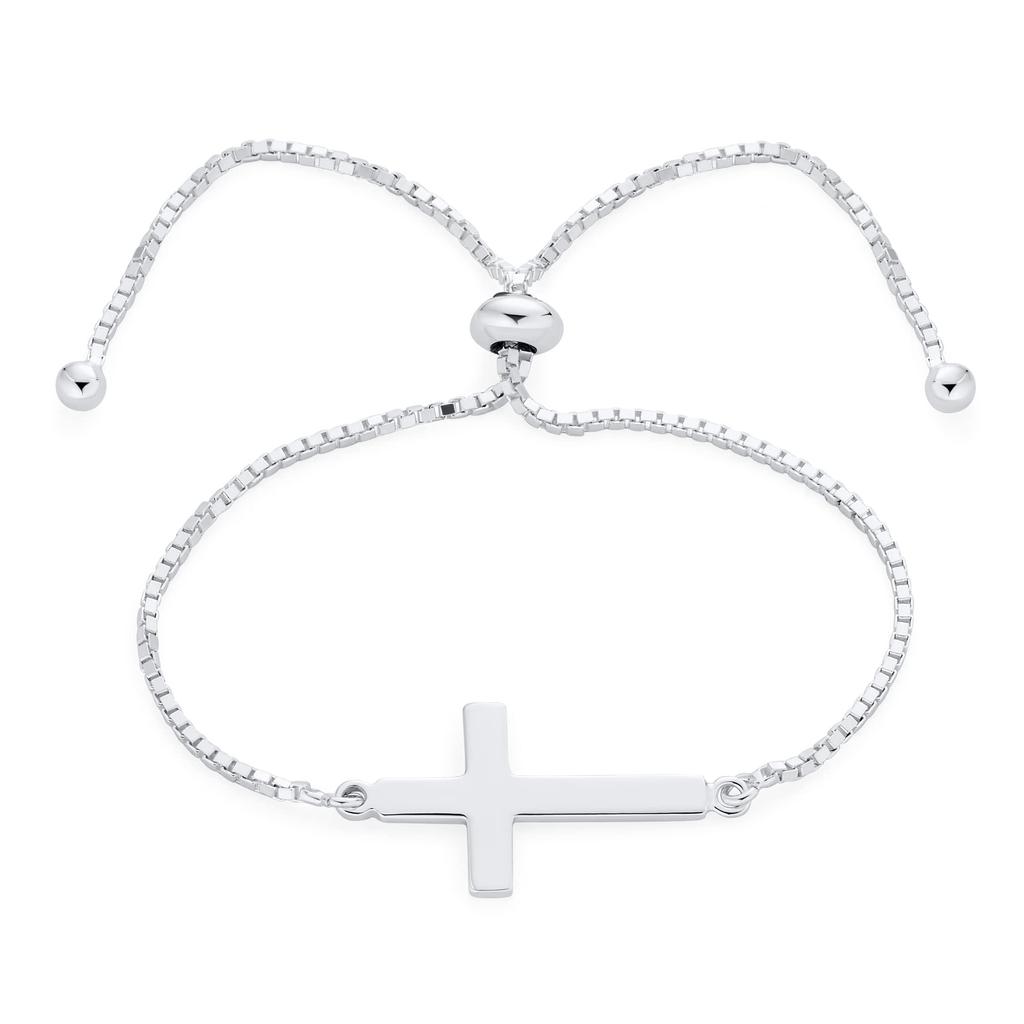 Dieses schlanke und modische Gleitketten-Kreuzarmband wird Ihnen helfen, Ihre Spiritualität mit einfachem, zeitlosem Stil zu umarmen. Zentriert um ein horizontales religiöses Kreuz, bedecken eine glänzende Panzerkette und Schieber und Endstücke im Bolo-Stil jedes Ende der Kette. Leicht und zart, aber dennoch kraftvoll.