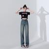 Spring and Summer New Pocket Contrasting Color Wide-leg Jeans for Women Retro Straight Floor Trousers for Women