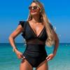 Solide Rüschen Rüschen Badeanzug Frauen Ein Stück Schwarz Bademode Weibliche V-ausschnitt Beachwear Badenden Baden Schwimmen Badeanzug