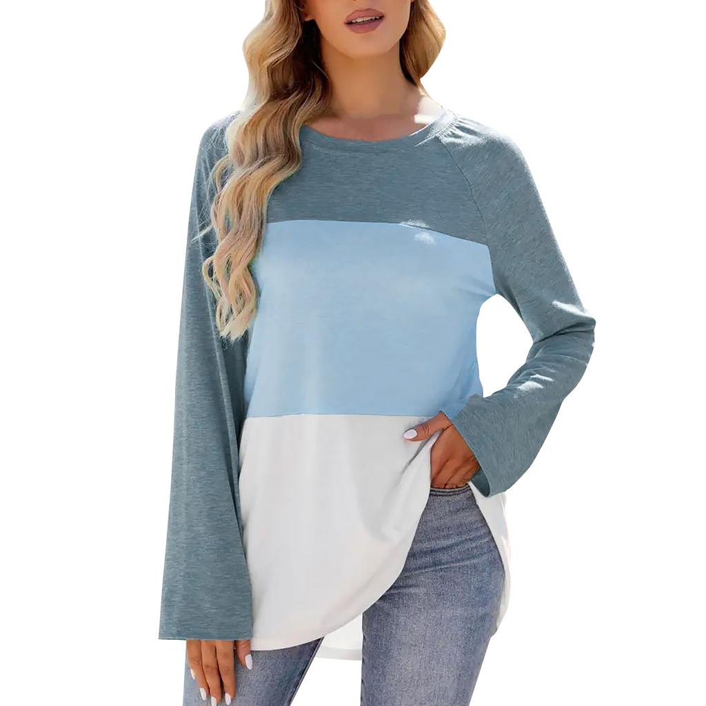 Women's Fashion Round Neck Splicing Casual Loose Long Sleeve T-Shirt Top